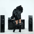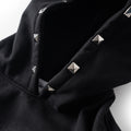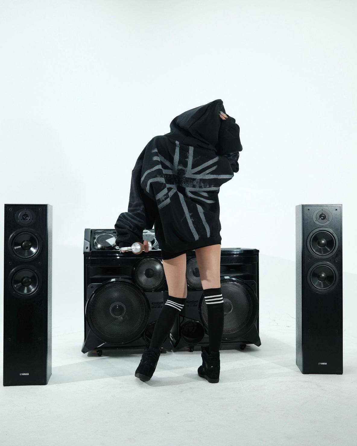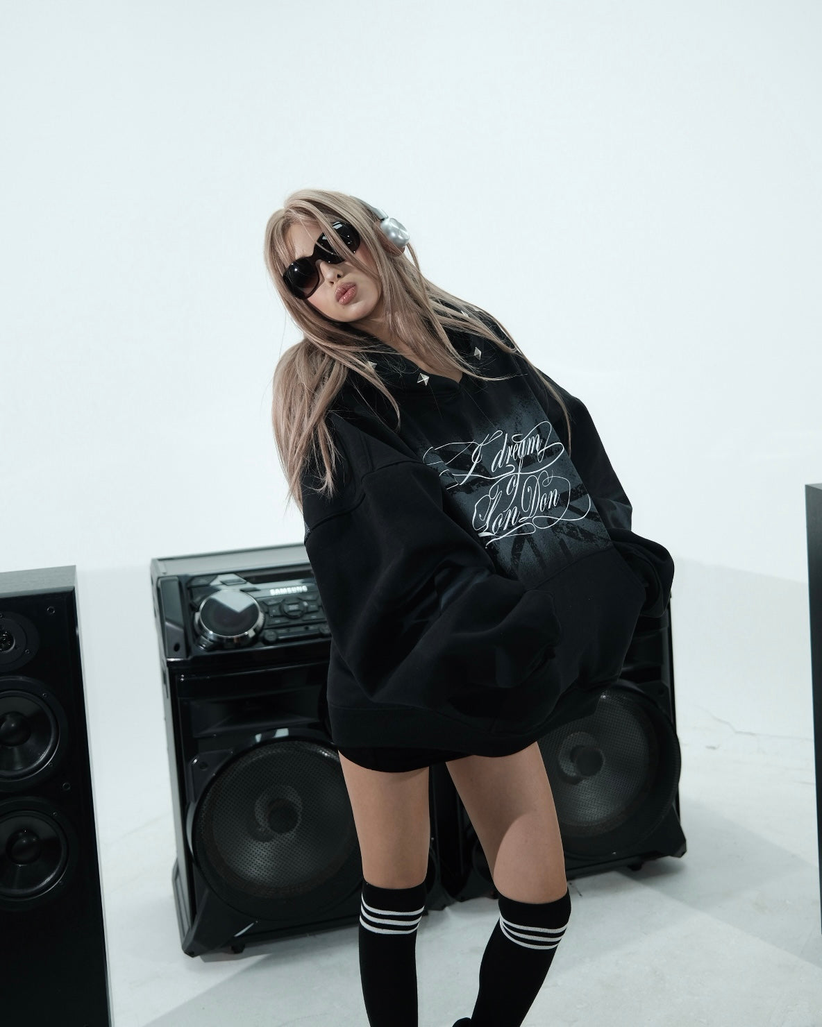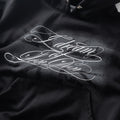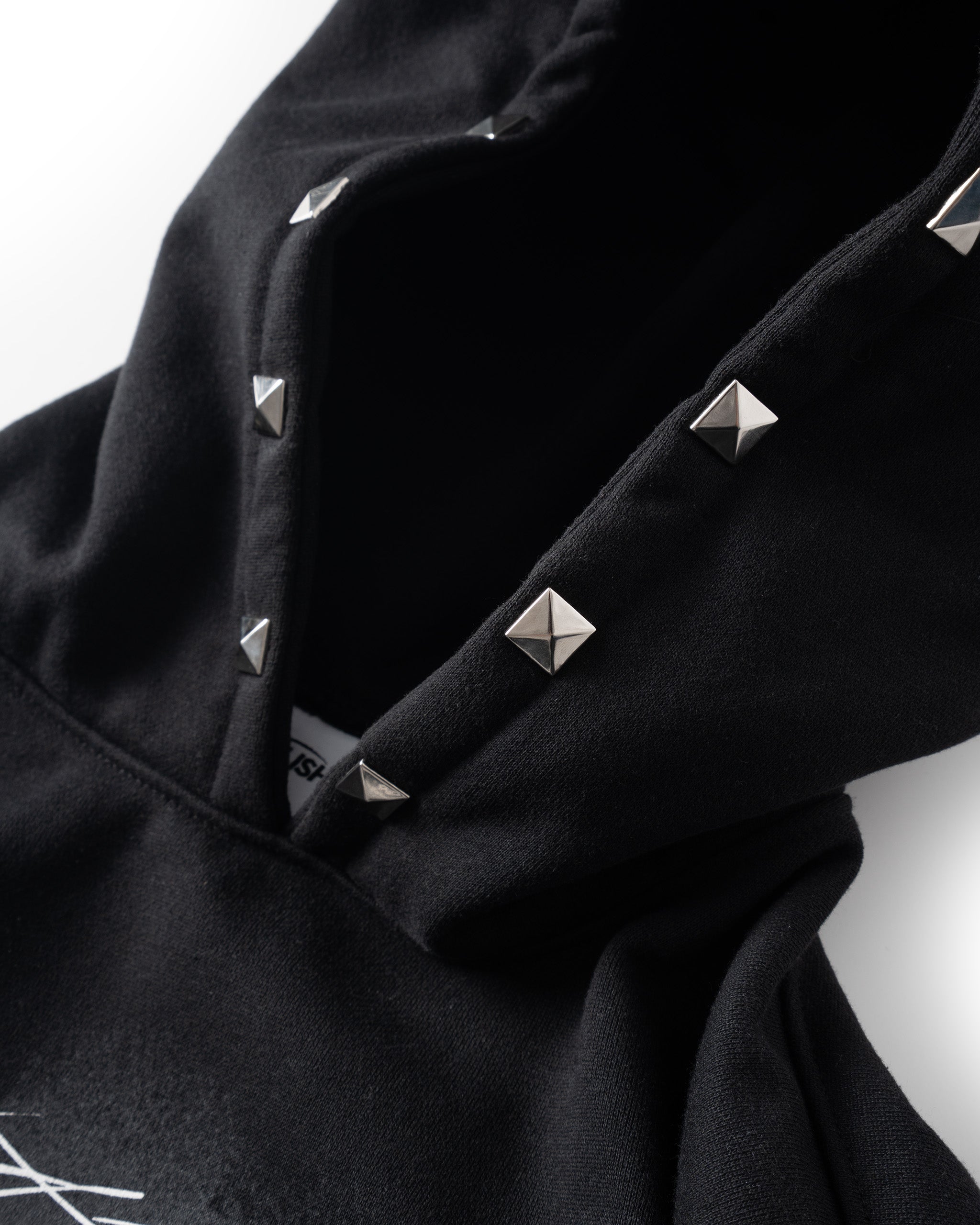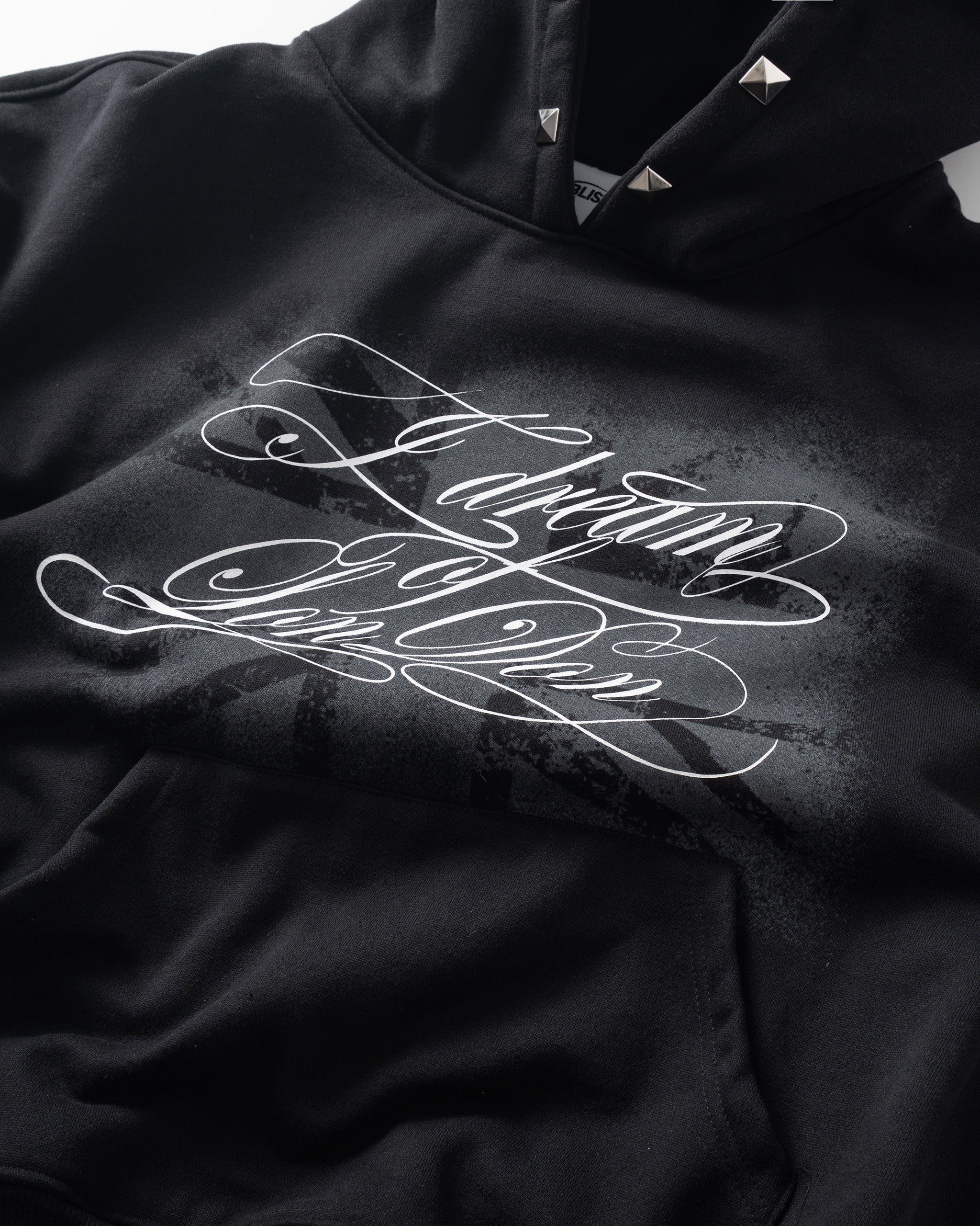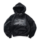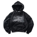 *Product Description : Hoodie in black. Oversized fit. 2 sizes. Silkscreen print font and back of the hoodie .